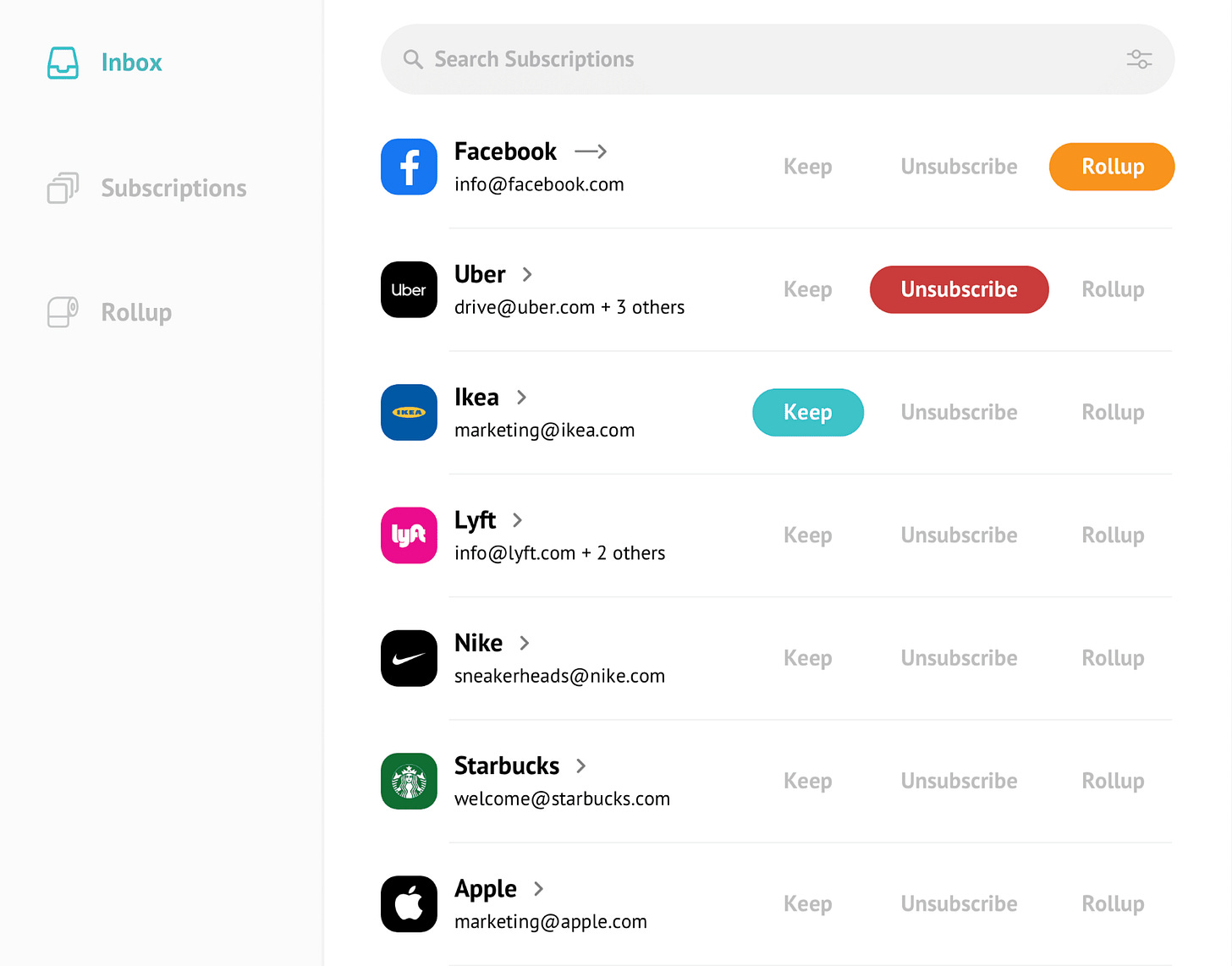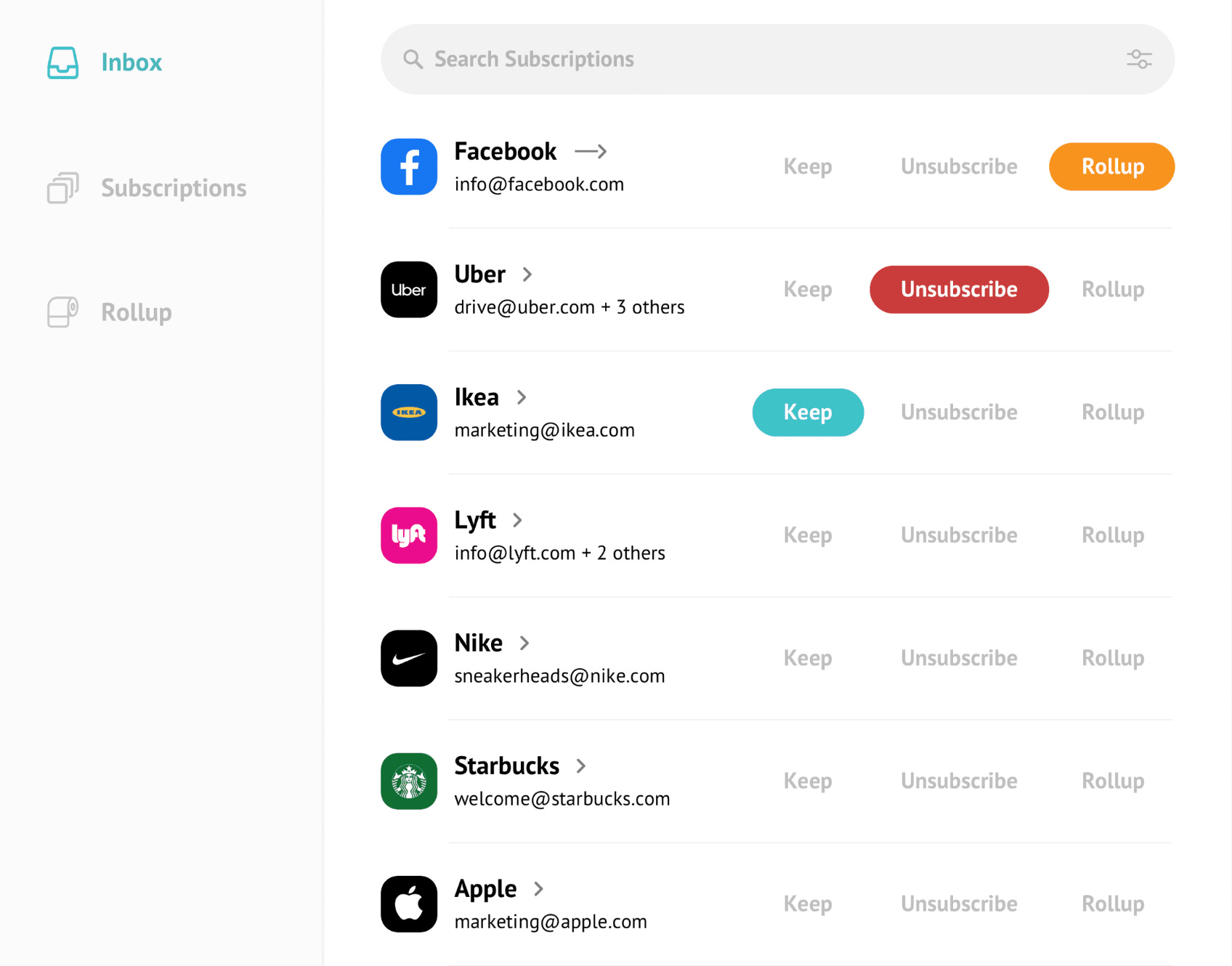 With Unroll.me you can quickly sort which email subscriptions you want to keep, unsubscribe from, or rollup into a daily email with a personal selection of newsletters. Try it out and let me know what you think!